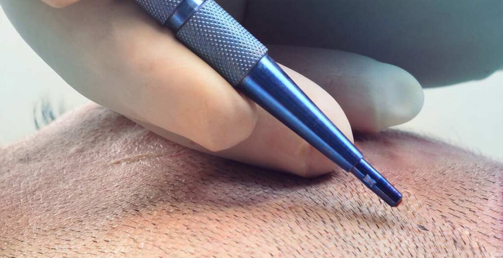 Estrazione dei follicoli piliferi: Come nelle procedure FUE convenzionali, i singoli follicoli piliferi vengono estratti dall’area donatrice del cuoio capelluto, di solito la parte posteriore o i lati, utilizzando strumenti specializzati come micropunture o sistemi robotici.